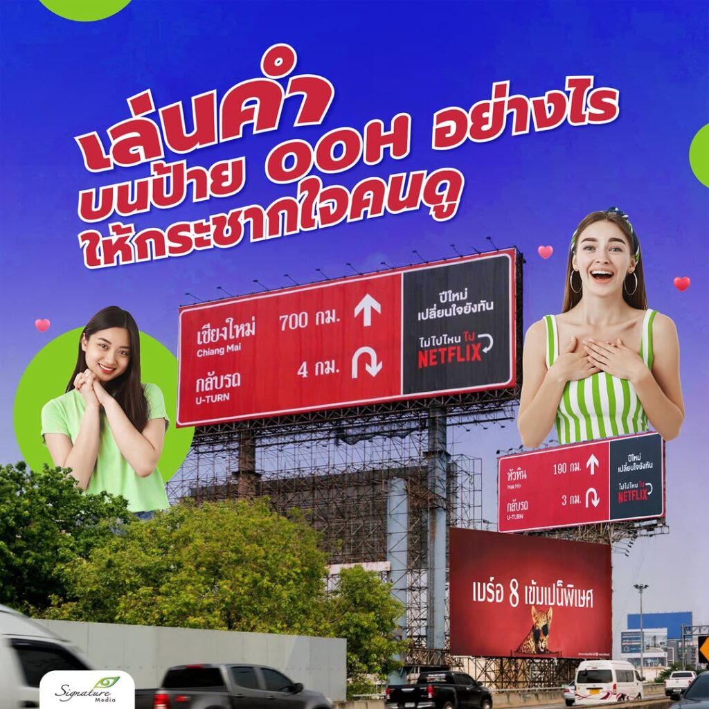 ตัวอย่างที่โดดเด่นคือแคมเปญ “ไม่ไปไหน ไป Netflix” ซึ่ง Netflix เลือกติดตั้งป้ายบิลบอร์ดไว้ในเส้นทางท่องเที่ยวยอดนิยมอย่างหัวหิน พัทยา และเชียงใหม่ โดยเล่นคำว่า “ถ้าไปต่อคือไปเที่ยว แต่ถ้ายูเทิร์นกลับคือกลับไปดู Netflix” สื่อสารได้ทั้งบริบทของสถานที่และอารมณ์ของคนที่กำลังขับรถไปเที่ยว